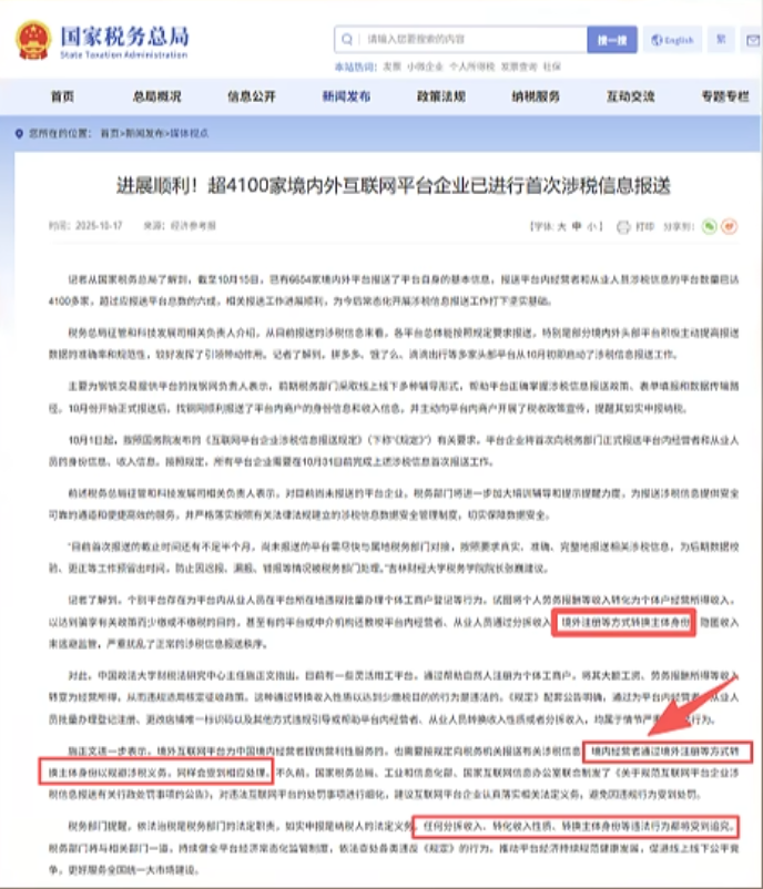 近期,国家税务总局官网发布的涉税监管动态引发跨境电商行业及带货主播群体高度关注。数据显示,已有 4100 家平台中超过六成完成首次涉税信息报送(图1-1),这一进度标志着跨境领域税收监管正从 “宽松化” 向 “精细化” 加速转变。更值得警惕的是,公告明确指出 “分拆收入、转化收入性质、转换主体身份等违法行为将被依法追究”,其中 “通过香港公司转换主体身份,归集收入规避境内纳税义务” 的操作,已成为税务机关重点排查的方向。本文将结合政策要求、典型案例及行业特性,分析此类操作的风险点。